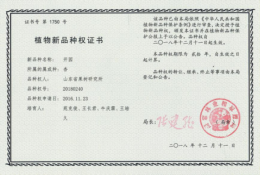 甜樱桃矮化砧木“矮杰”植物新品种证书