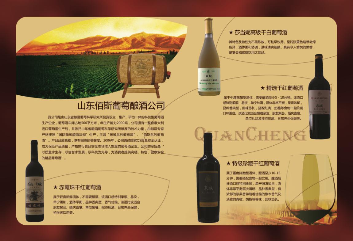 山东佰斯葡萄酿酒公司是由山东省酿酒葡萄科学研究所投资设立,集产、研为一体的科技型葡萄酒生产企业。公司拥有一整套意大利进口葡萄酒生产线,并依托山东省酿酒葡萄科学研究所雄厚的技术力量,由酿酒专家严格按照“国际葡萄酿酒法规”生产,主营“泉城系列葡萄酒”“佰斯系列葡萄酒”。